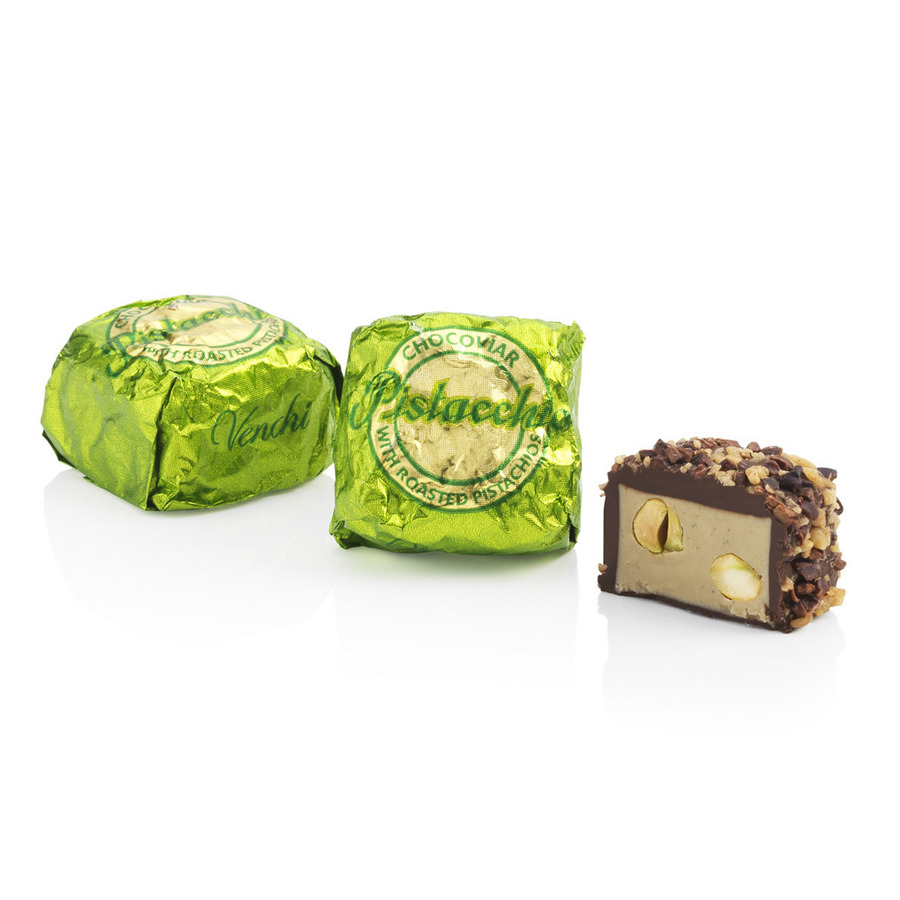 チョコビアピスタチオは、ホールピスタチオ入りのピスタチオ&ヘーゼルナッツフィリングを、ダークチョコレートでコーティングし、トーフィーとカカオニブをまとわせた贅沢な一粒。